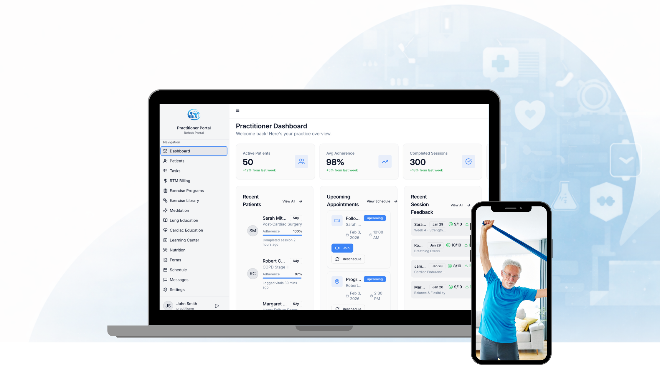 The Rehab Portal includes both a Practitioner Portal for care teams and a Patient Portal that delivers personalized exercise, education, and monitoring tools at home. This hybrid model helps extend care beyond the clinic and supports patients between visits.